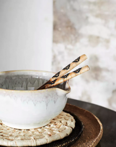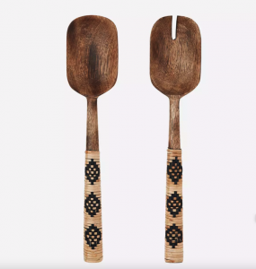 Juego de cucharas para ensalada talladas a mano en madera de mango de la India con finas asas decoradas en bambu.