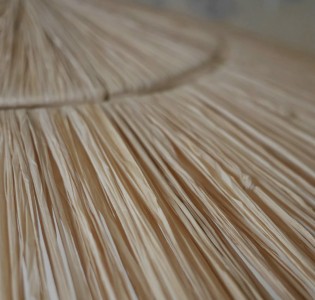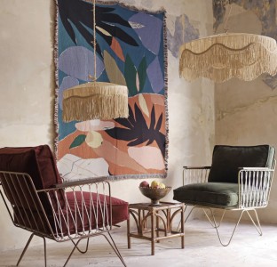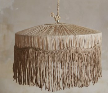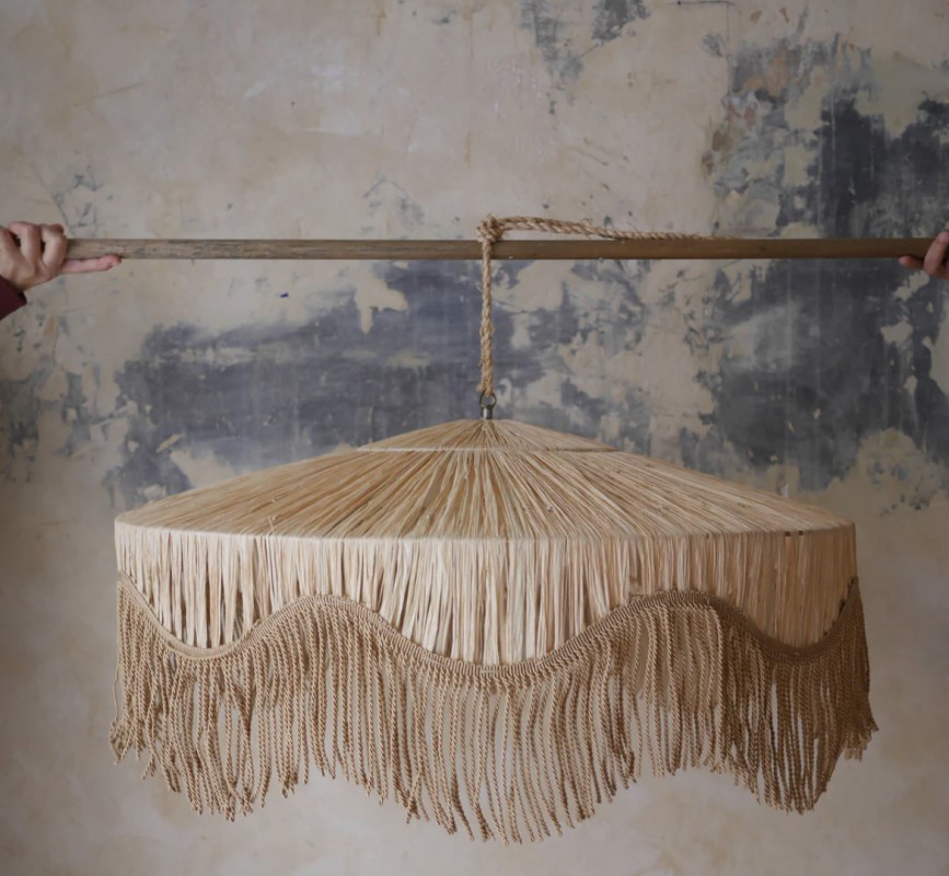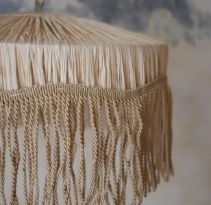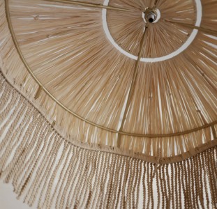 estructura de metal, rafia natural y flecos de algodon color oro.