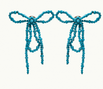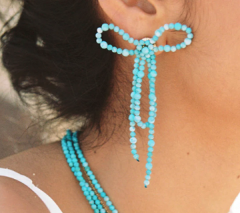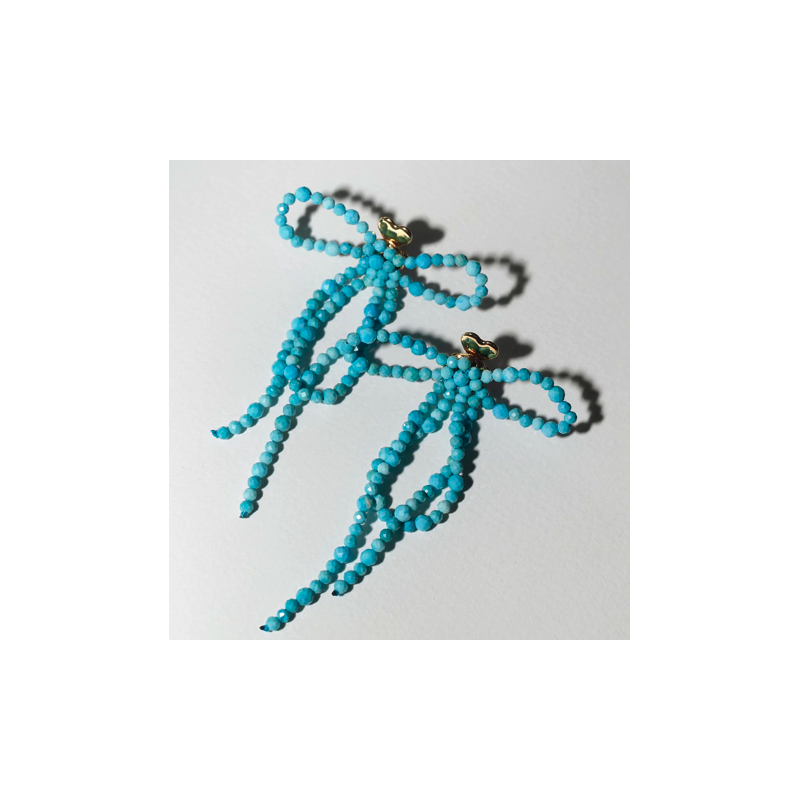 Los pendientes Isisestán formados por piedras de polvo turquesa, ensartadas una a una a mano con hilo de nylon, formando románticos lazos. Son piezas delicadas, con un alto nivel de trabajo artesanal, que los convierte en una joya de culto única.