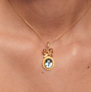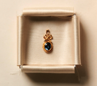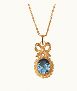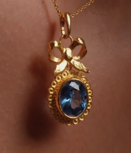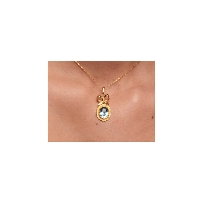 Collar compuesto por una cadena y un amuleto con un cristal azul. El colgante está inspirado en las joyas isabelinas que se hicieron populares durante el reinado de Isabel II de España,