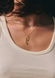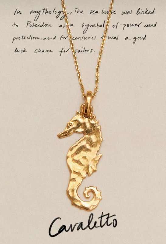 Collar Cavaletto. En la mitología, el caballito de mar estaba ligado a Poseidón como símbolo de poder y protección, y durante siglos fue un amuleto de buena suerte para los marineros. Su forma delicada y su nado pausado nos invitan a confiar en nuestro propio ritmo, habitando el mar y la vida con equilibrio y alegría. Este colgante es una joya talismán que conecta con el imaginario marino y la fuerza simbólica del océano.