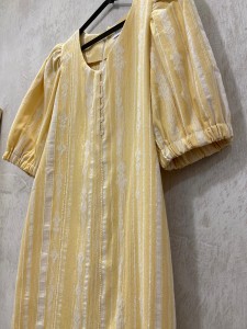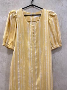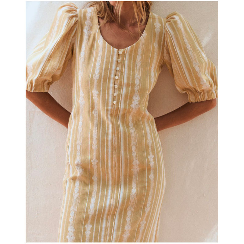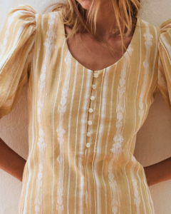 VESTIDO MIDI CORTE RECTO CON MANGA MUY ABULLONADA POR ENCIMA DEL CODO. ESCOTE REDONDO. PARTE DELANTERA CON BOTONES.