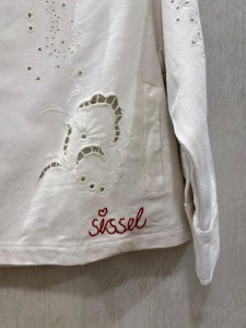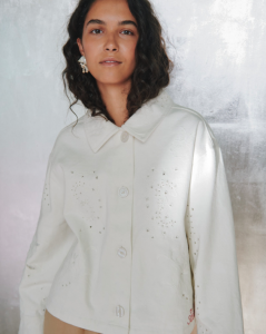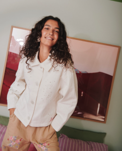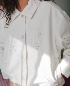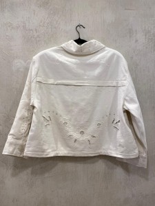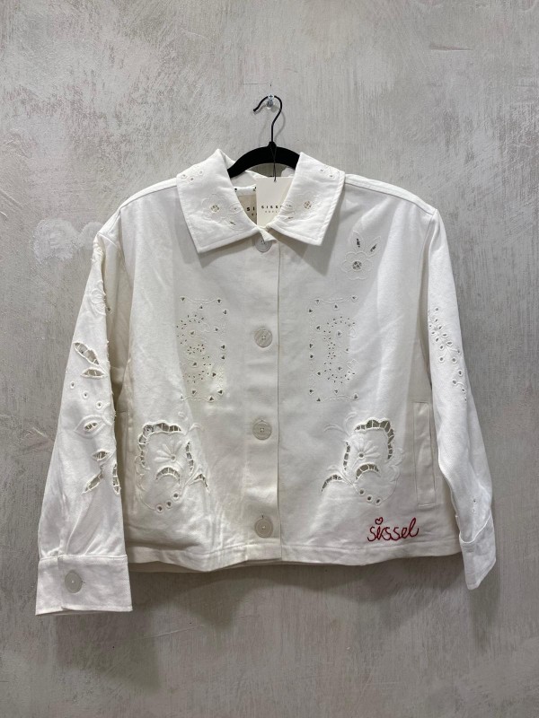 Chaqueta de estilo vintage confeccionada en sarga de algodón y corte informal. Presenta cuello y una amplia tapeta frontal con grandes botones de nácar claro. Tiene mangas largas con puños anchos y bolsillos delanteros. El interior está forrado con un estampado floral. La chaqueta está decorada con delicados bordados calados y un pequeño bordado con la firma «SISSEL».