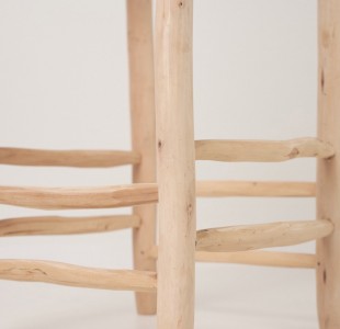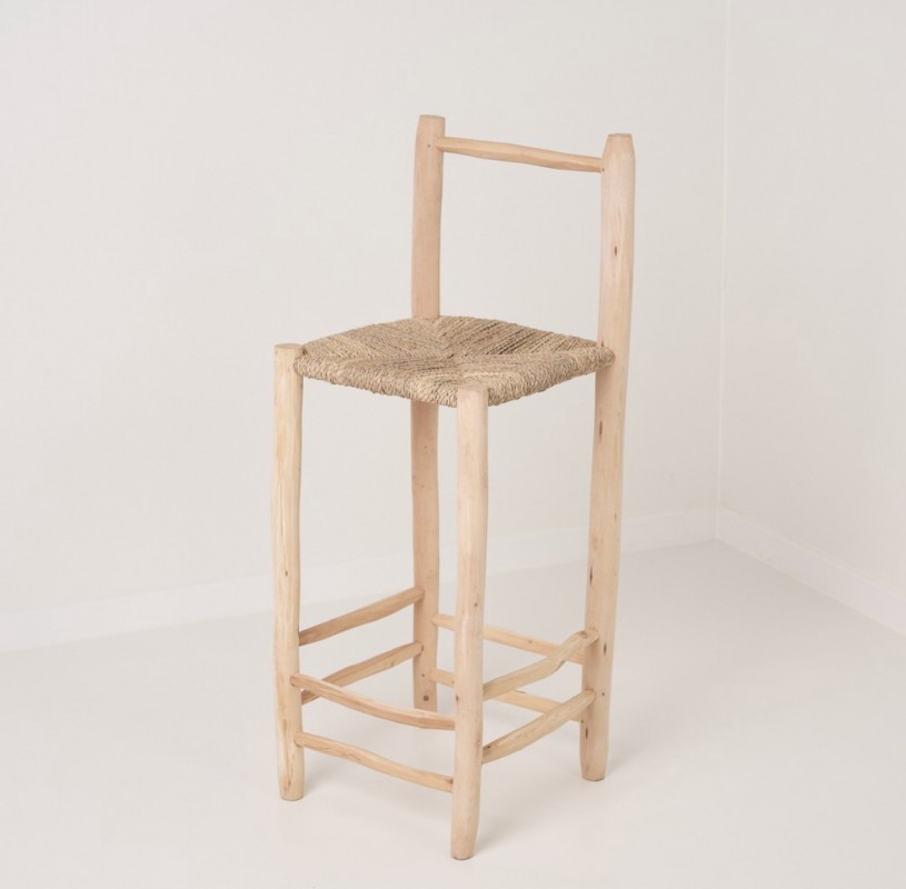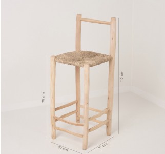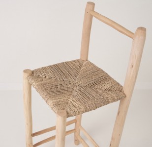 Taburete estilo mediterráneo con respaldo en barra. Elaborado con madera y hilo al más puro estilo.